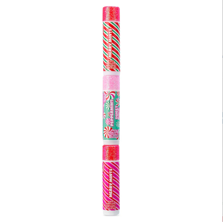 En un envase de bastón de caramelo se encuentran tres lip balm con olor a menta.