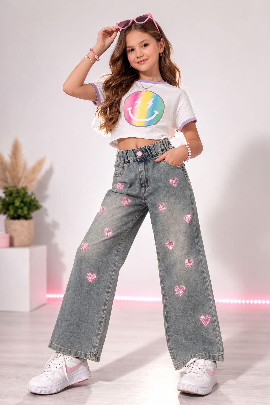Los Sweetheart Denim jeans son la combinación perfecta entre comodidad y ternura. Confeccionados en mezclilla suave de tono lavado, destacan por sus delicados corazones rosados bordados que le dan un toque divertido y encantador.
